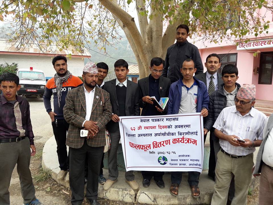 नेपाल पत्रकार महासंघ जिल्ला शाखा अर्घाखाँचीकाे अायाेजनामा सम्पन्न कार्यक्रममा जिल्ला स्वास्थ्य प्रमुख डा.जगन्नाथ तिवारी ,अस्पताल विकास समितिका अध्यक्ष कृष्ण खनाल, महासंघ पुर्व अध्यक्ष विष्णु भुसाल लगायतको उपस्थित रहेको थियो ।
