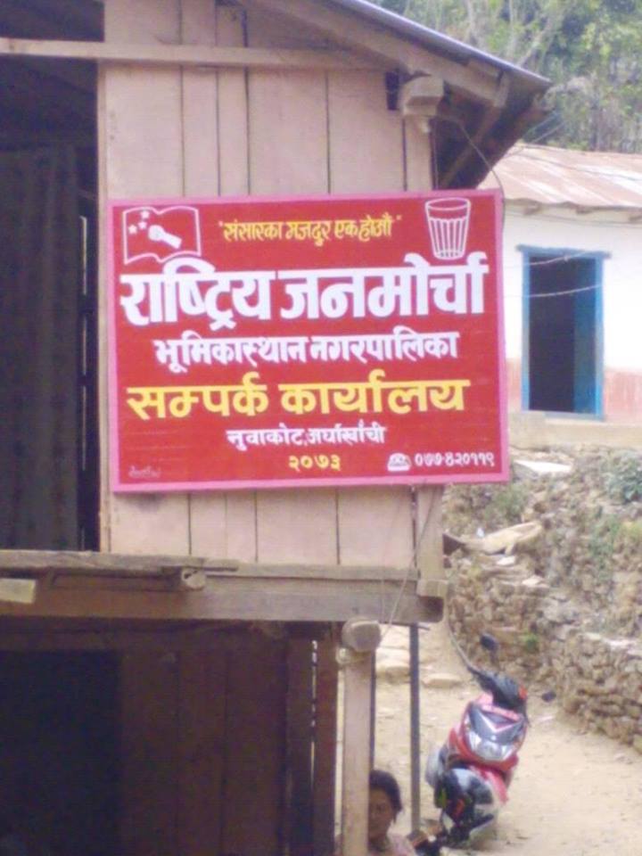 कार्यालय साबिक नुवाकोट गा.बि.स.को हटिया बजारमा रहेकाे छ । राष्ट्रिय जनमोर्चाको भुमिकास्थान नगरपालिकामा राम्रो जनमत रहेको छ । यहाँ राष्ट्रिय जनमोर्चाको कांग्रेस एमालेसँग प्रतिस्पर्धा हुनेछ ।