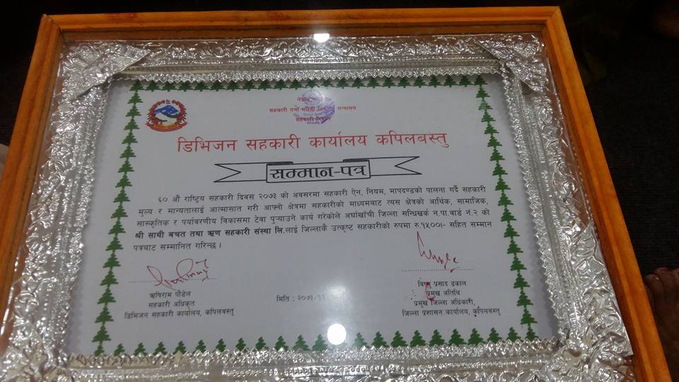 अडिट प्रतिवेदन र मासिक प्रतिवेदन वुझाई वित्तीय अवस्था सुढृढ राखी , आफ्ना उत्कृष्ट सेवा प्रदान गर्दै आएको भनि साथी वचत तथा ऋण सहकारी संस्थालाई कपिलवस्तु र अर्घाखॉचीको वचत तथा ऋण सहकारी संस्थाको रुपमा दोस्रो पटक डिभिजन सहकारी कार्यालय कपिलवस्तुले तौलिहवामा आयोजित एक कार्यक्रमका विच उत्कृष्ट सहकारी संस्थाको रुपमा पुरस्कृत गरेको हो।
