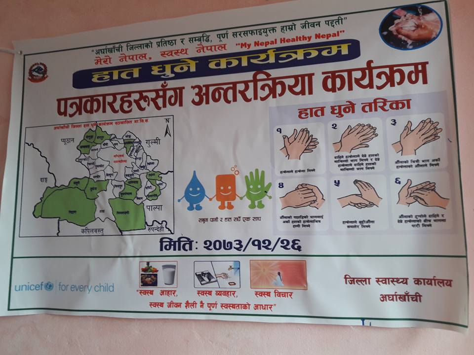 जिल्ला स्वास्थ्य कार्यालय अर्घाखाँचीकाे अायाेजनामा हात धुने कार्यक्रम अन्तरगत पत्रकारसँग अन्तरक्रिया कार्यक्रम सम्पन्न भएको हो ।