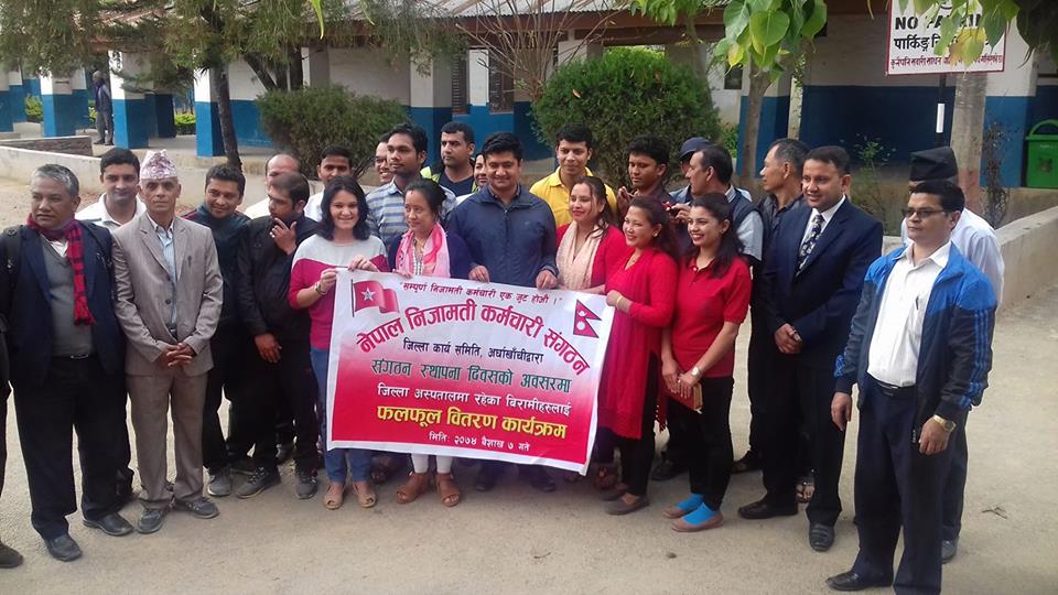 सन्धिखर्क, अर्घाखाँची ( अर्घाखाँचीडट्कम) । नेपाल निजामती कर्मचारी संगठन काे ६७अाैं स्थापना दिवसको अबसरमा जिल्ला कार्य समिति अर्घाखाँचीले बिरामीलाई फलफुल बितरण कार्यक्रम सम्पन्न गरेको छ ।