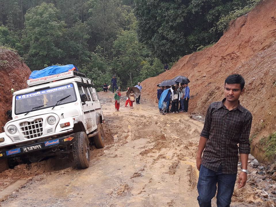 सन्धिखर्क नगरपालिका वाङ्गलामा बाटो जिप्लो भएर फसेको गाडी तस्विर : घनश्याम पौडेल
