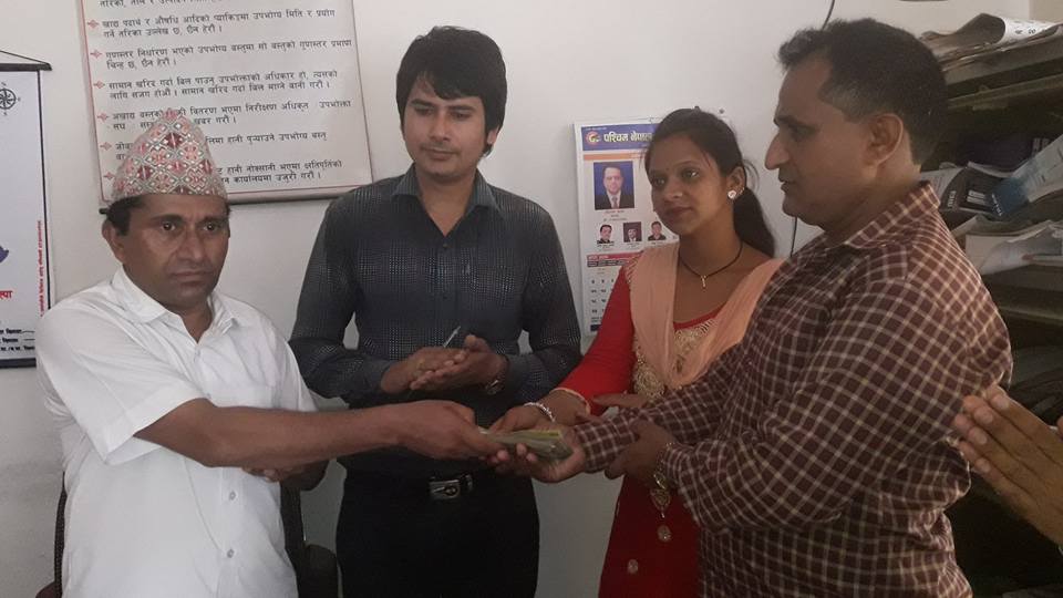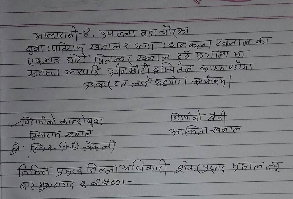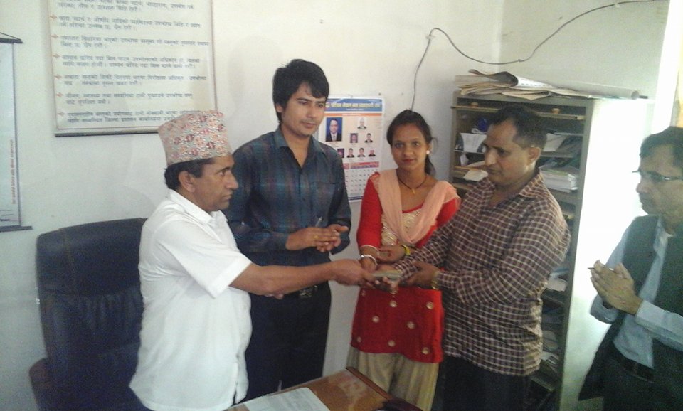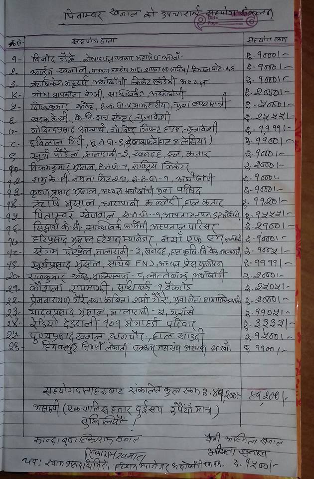 पत्रकार कमल विष्टको सक्रियतामा संकलित रकम आज एक कार्यक्रमको आयोजना जिल्ला प्रशासन कार्यालयका निमित्त प्रमुख जिल्ला अधिकारी शङकर भुसालको कार्यक्रक्षमा निजका कान्छोबुबा टिकाराम खनाल र विरामीको बैनी अस्मिता खनाललाई निप्रजिअ भुसालले पैतालिस हजार दुई सय हस्तान्तरण गरिएको हो ।