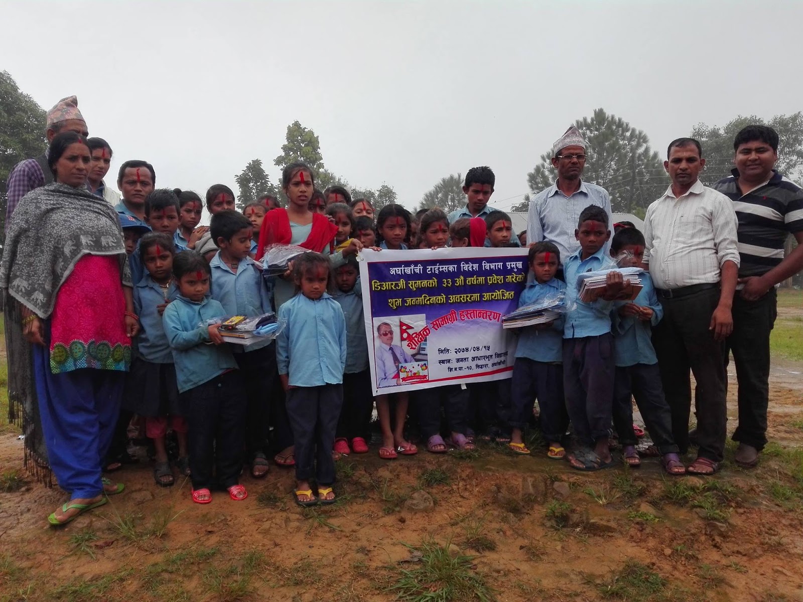 अर्घाखाँचीडट्कमका अन्तरराष्ट्रिय प्रमुख प्रतिनिधि तथा अन्तर्राष्ट्रिय अर्घाखाँची सम्पर्क मन्चका अध्यक्ष डिआरजी घिमिरे सुमनको ३३ औ बर्षमा प्रबेश गरेर शुभ अबसरमा आईतबार सित गंगा नगरपालिका वडा नम्वर १० मा रहेको जनता आधारभुत बिद्यालय सिद्धारामा ५ जना बिद्यार्थीलाई एक कार्यक्रमका बिचमा सो साम्रगी स्तानतरण गरिएको हो ।