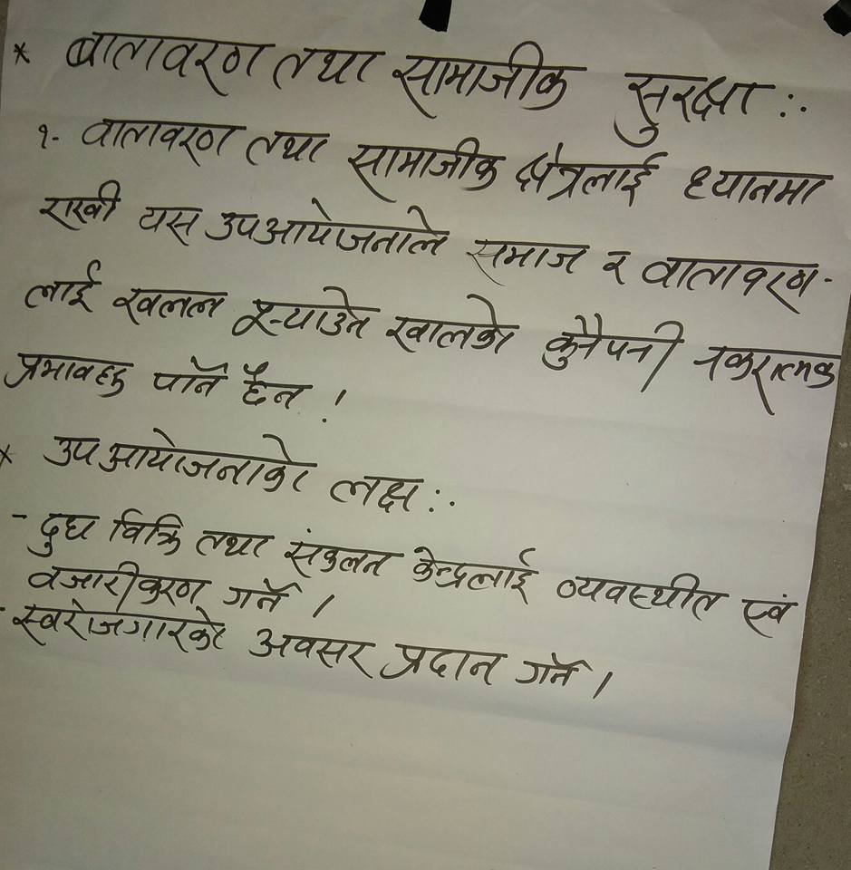सार्बजनिक सुनुवाई कार्यक्रममा प्रमुख अतिथिको रुपमा मनतब्य राख्दै केयुबिके बाख्रा बिकास प्राबिधिक राधा नेपालीले कृषकहरुको जीवन स्तर उकास्नका लागि केयुविकेको कार्यक्रम प्रभावकारी बन्ने विश्वास व्यक्त गर्नुभएको थियो । साथै उहाँले किसानका लागि आएकोे अनुदान रकम आम नागरिकहरुले देख्ने गरि सार्वजनिक हुनु पर्ने बताउदै प्रमुख अतिथी नेपालीले जिल्लालाई दुधमा आत्मानिर्भर बनाउनको लागि दुध उत्दपादन क्षेत्र छुट्टाएर काम आगाडि बढाएको बताउनु भएको थियो ।