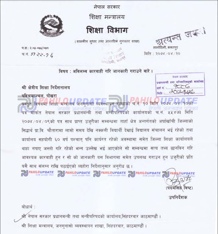 नक्कली विद्यार्थी देखाई विद्यालय संचालन गर्नुका साथै ६० बर्ष भन्दा माथीका कर्मचारीले कार्यालय सहयोगीको रुपमा काम गरेको भन्दै विभागले तत्काल आवश्यक कारवाही गर्न पश्चिमाञ्चल क्षेत्रीय निर्देशनालयलाई आदेश गरेको हो ।