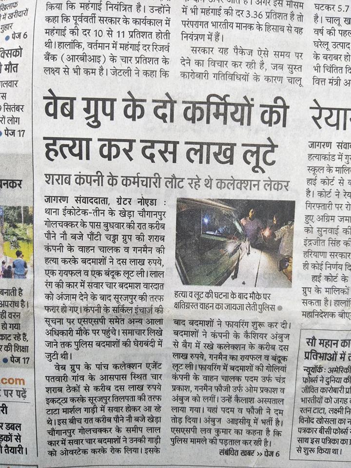 नोएडा स्थित एक पोंटी चड्डा ग्रुप , वेब “शराब” कम्पनीमा कार्यरत अर्घाखाँची जिल्लाको सन्धिखर्क नगरपालिका वार्ड नम्बर १५ डिभर्नाको अमिलेका पदम भनिने चन्द्र बहादुर बिकको बुधबार राती डिउटीको समयमा केही अज्ञात समुहले गोलीबाट हानी निर्ममता पुर्ण हत्या भएको हो ।