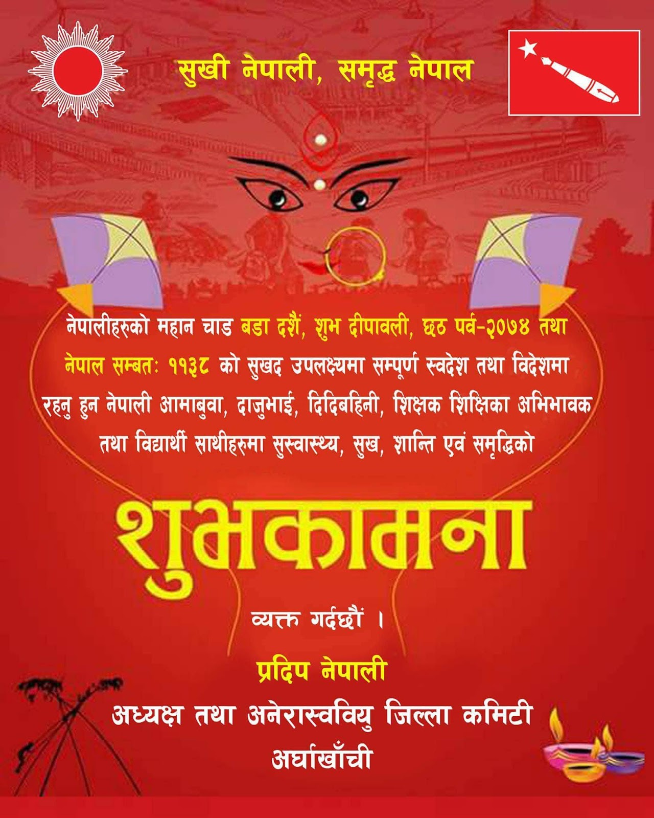 नेपाली हरुको महान चाड विजया दशमी तथा दीपावली, छठ, वकर ईद – २०७४ को पावन अवसरमा देश-विदेशमा रहनुहुने हाम्रा प्यारा जिल्लावाँसी, देशबासी, प्रवासी सम्पुर्ण वुवाआमा दाजु भाई दिदीवहिनी सवैमा सुख शान्ति एवं समृद्धिको मंगलमय शुभकामना व्यक्त गर्दछौ ।