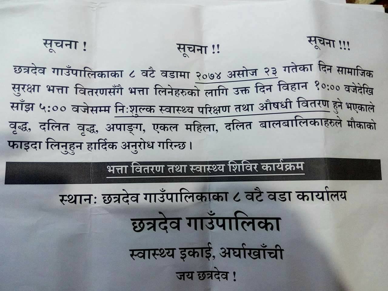 सामाजिक सुरक्षा भत्तासँगै भत्ता लिन अाउनेहरुका लागि यही असोज २३ गते सोमबारका दिन विहान विहान १० बजे देखि साँझ ५ बजे सम्म निशुल्क स्वास्थ्य परिक्षण तथा औषधी वितरण गरिने भएको हो ।