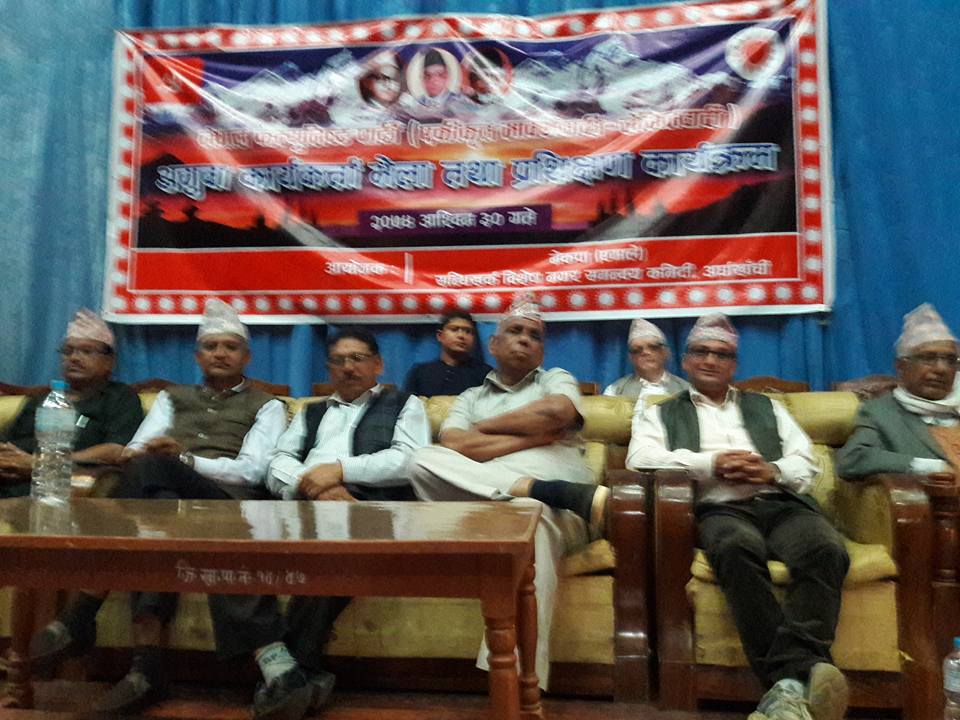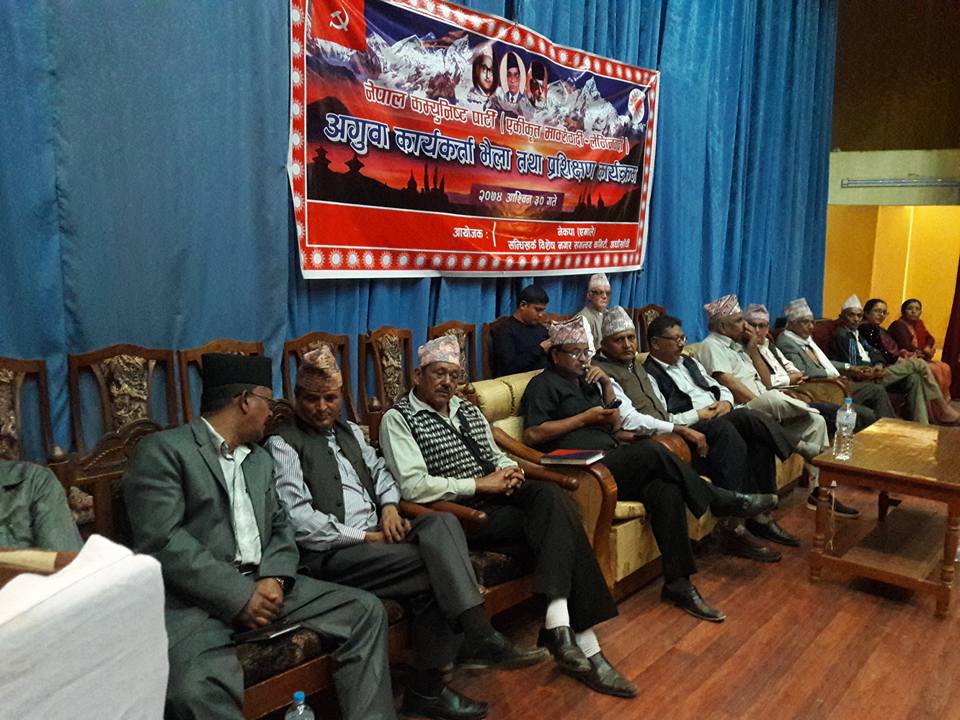 अगुवा कार्यकर्ता भेला तथा प्रशिक्षण कार्यक्रममा जिल्ला कमिटी अध्यक्ष तथा प्रस्तावित प्रदेश सभा सदस्य क्षेत्र नम्बर १ उम्मेदवार चेतनारायण आचार्य, वार्ड न.२ का अध्यक्ष माेतिजङ रायमाझी र निर्वाचन क्षेत्र न.२ का सचिव शम्भु प्रसाद पोखरेल लगायत बोलेका थिए ।