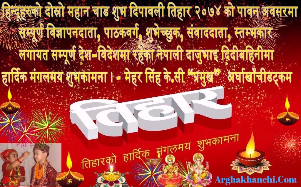 हिन्दूहरुको दोस्रो महान चाड शुभ दिपावली तिहार २०७४ को पावन अवसरमा सम्पूर्ण विज्ञापनदाता, पाठकवर्ग, शुभेच्छुक, संवाददाता, स्तम्भकारलगायत सम्पूर्ण देश-विदेशमा रहेका नेपाली दाजुभाइ दिदीबहिनीमा हार्दिक मंगलमय शुभकामना ।