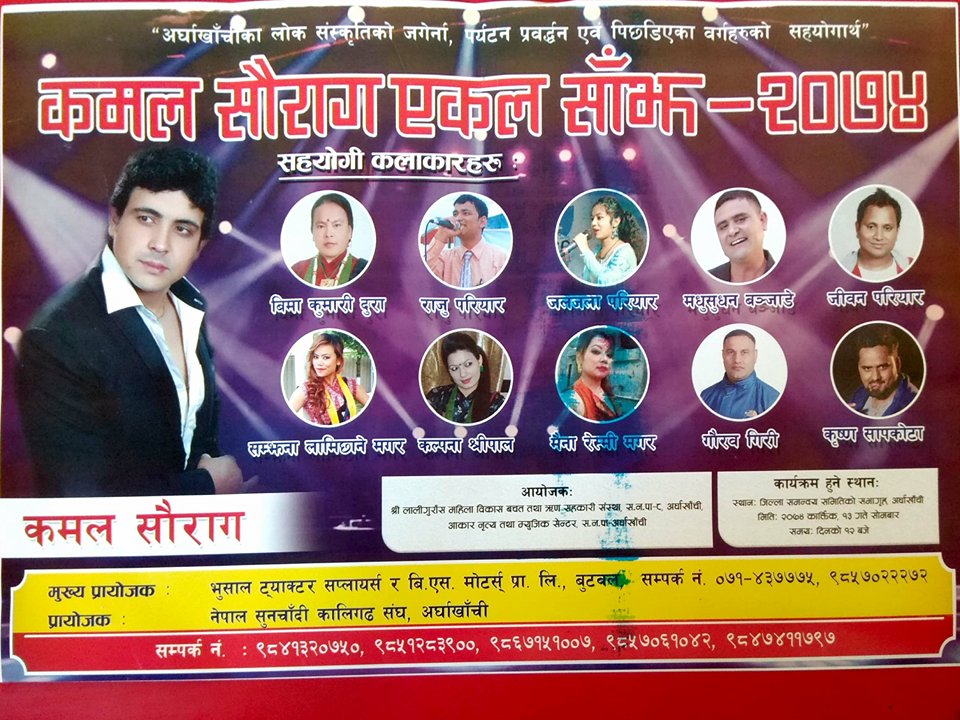 अर्घाखाँचीका लोक सस्कृतिको जर्गेना, पर्यटन प्रबद्र्धन एबं पिछिडिएका वर्गहरुको सहयोगार्थ लाली गुरास महिला विकास वचत तथा ऋण सहकारी सस्था र आकार नृत्य तथा म्युजिक सेन्टरको आयोजनामा आउदो कात्तिक १३ गते सोमवार कमल सौराग एकल साँझ हुन थालेको हो ।