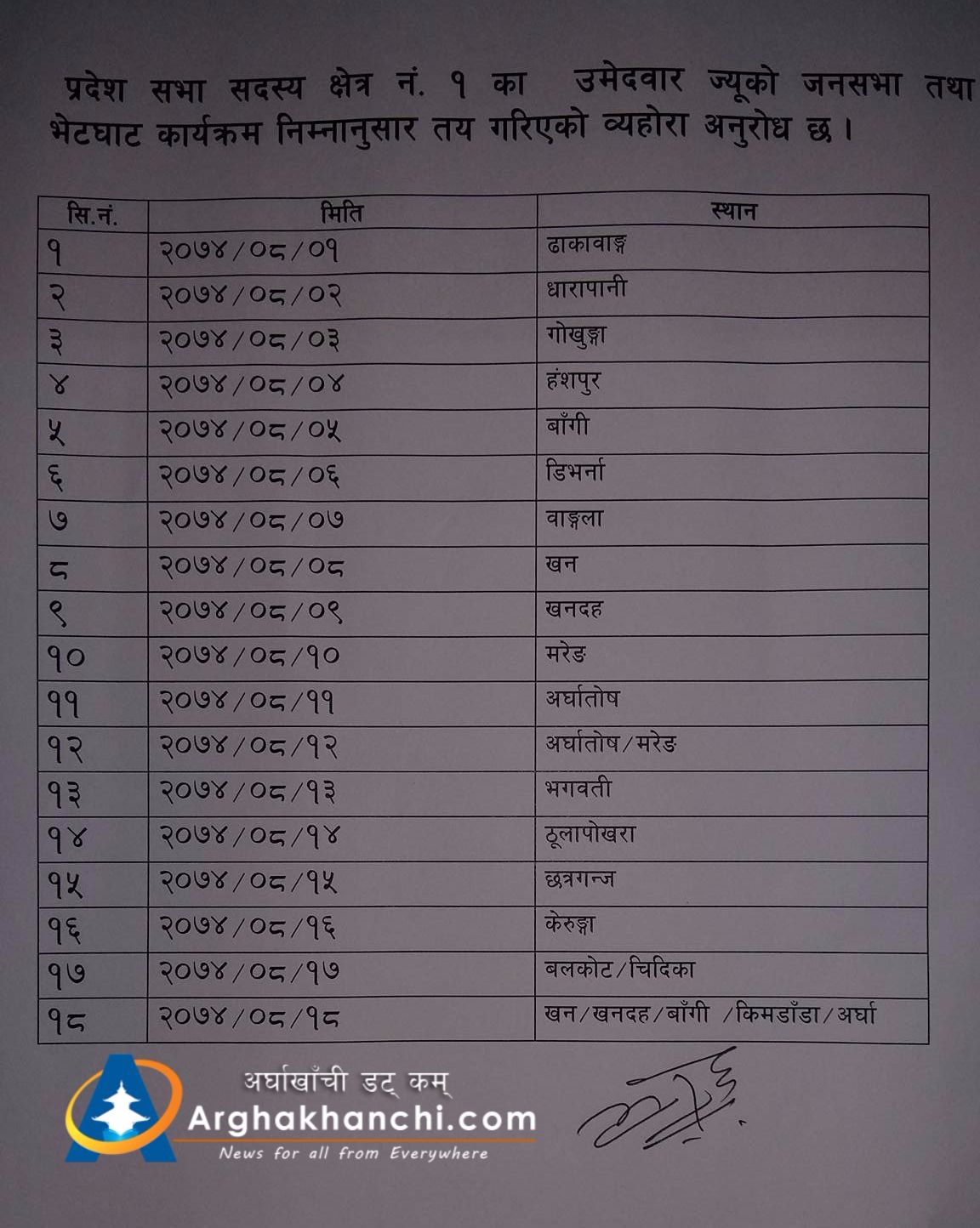 प्रतिनिधि तथा प्रदेश सभा क्षेत्र नम्बर १ र २ मा हुने चुनावी सभा तथा भेटघाट कार्यक्रम