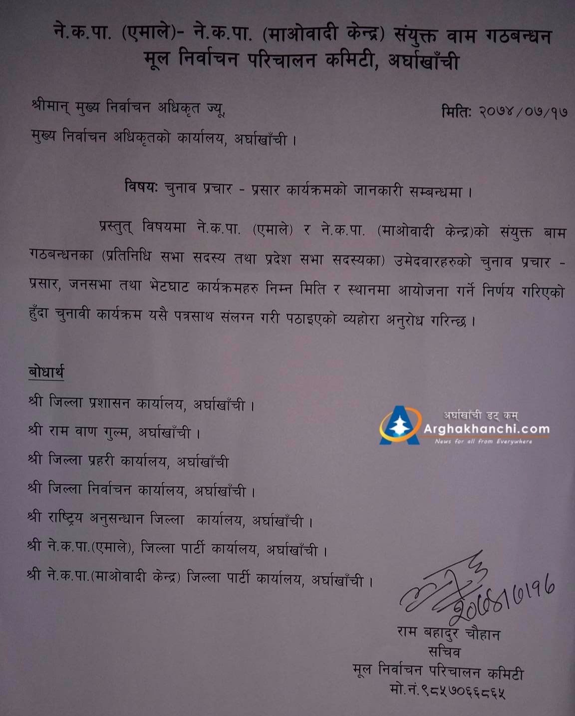वाम गठबन्धनले कार्तिक २३ गते देखी मंसीर १८ गते सम्मका चुनावी सभा तथा भेटघाट कार्यक्रम समेत सार्वजनीक गरेको छ । माओवादी केन्द्रका केन्द्रीय सचिवालय सदस्य चन्द्रबहादुर खड्का उज्वलको अध्यक्षता र एमाले सचिब रामबहादुर चौहानको संचालनमा सम्पन्न पत्रकार सम्मेलनमा माओवादी केन्द्रका नेता टोपबहादुर रायमाझी,एमालेका केन्द्रीय सदस्य नजिर मियाँ, बाम गठबन्धन प्रदेश सभा क्षेत्र नं.१ का उमेदवार तथा एमाले जिल्ला अध्यक्ष चेतनारायण आचार्य, बाम गठबन्धन प्रदेश सभा क्षेत्र नं.२ का उमेदवार तथा एमाले पूर्व जिल्ला अध्यक्ष रामजी प्रसाद घिमीरे लगायतका बक्ताहरुले मन्तव्य राख्दै मुलुकको राष्ट्रीय अखण्डताको रक्षा,आर्थिक सम्बृद्धि,दिगो बिकास र राजनितीक स्थिरताको लागि बापन् सरकारको खाँचो औल्याए ।