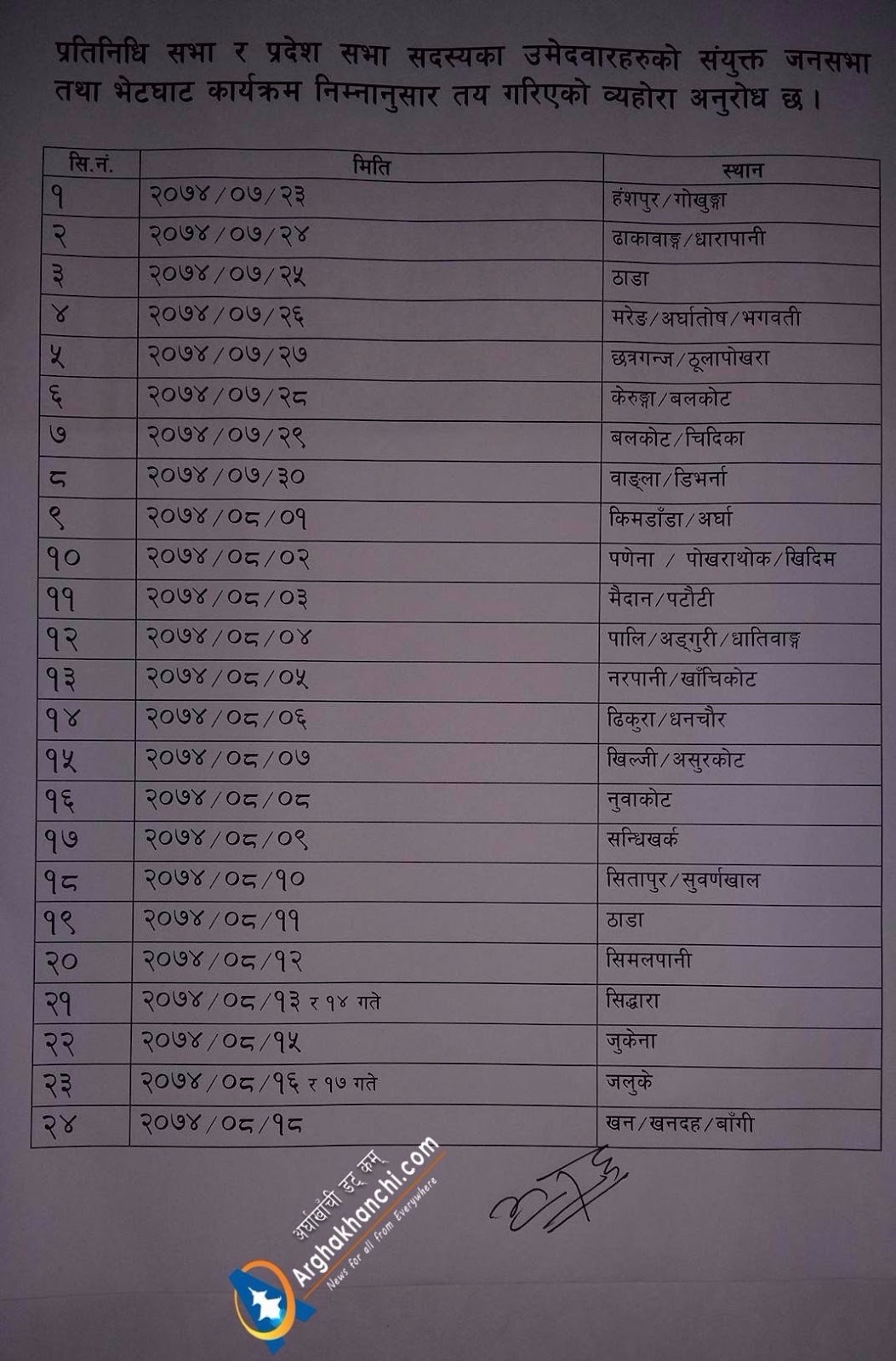 जिल्लाभर कार्तिक २३ गते देखी मंसीर १८ गते सम्मका हुने चुनावी सभा तथा भेटघाट कार्यक्रम विवरण:-