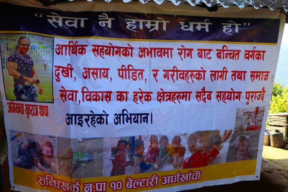 अर्घाखाँचीका एक मात्र समाजसेवी युवाराज थापाले जिल्लाका कयौ पैसाको अभावमा उपचार गर्न नसक्ने विरामीहरुलाई नयाँ जीवन दिदै आएका छन् । अर्घाखाँचीको ईतिहासमा पहिलो समाजसेवीको रुपमा युवाराज थापा स्थापित भएका छन् । सन्धिखर्क नगरपालिका वार्ड न १० – अर्घा बेल्टारीका युवाराज थापा धेरैजनाको ज्यान बचाएका र गरिव असाहय-अशक्त बालबालिका देखि वृद्धसम्मका धेरै व्यक्तिलाई विदेशमा बसेर पनि सहयोग गर्दै आएका छन् ।