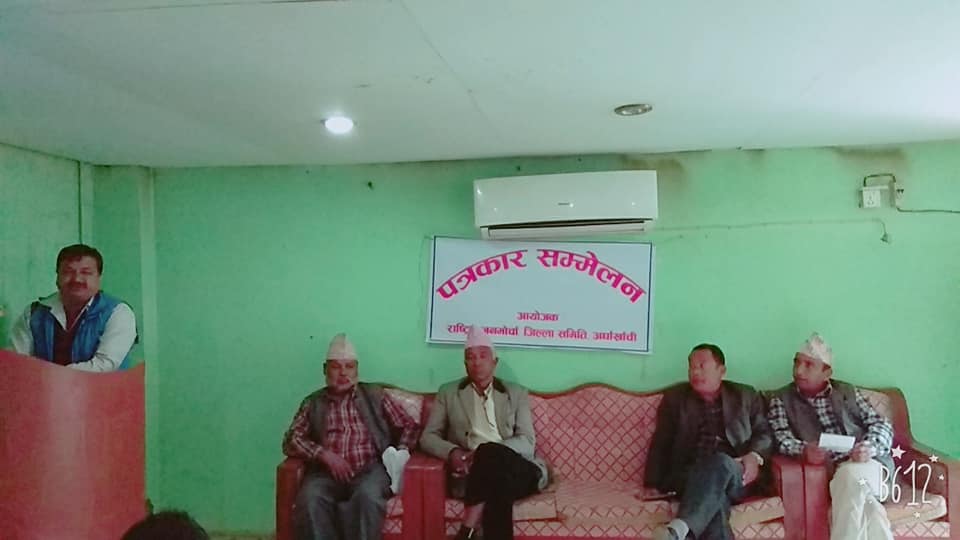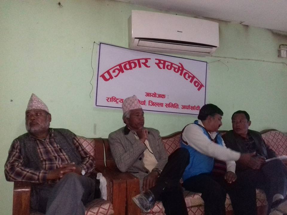 सन्धिखर्कको होटल क्रिस्टिनामा पत्रकार सम्मेलन आयोजना गरि प्रतिबद्धतापत्र सहित कार्यक्रम सार्बजनिक गरिएको घोषणा सभामा मन्तव्य राख्दै राष्ट्रिय जनमोर्चाका नेता शेर बहादुर बिसी अर्घाखाँची प्रदेश सभा निर्बाचन क्षेत्र नम्बर एकका उम्मेद्धार सागर के।सी।र क्षेत्र नम्बर दुइका उम्मेद्धार झबिलाल थापाले देशमा गणतान्त्रिक संबिधान आएपनि शान्ति र समृद्धिको महसुस जनताले गर्न नपाएको बताउनुभएको छ ।