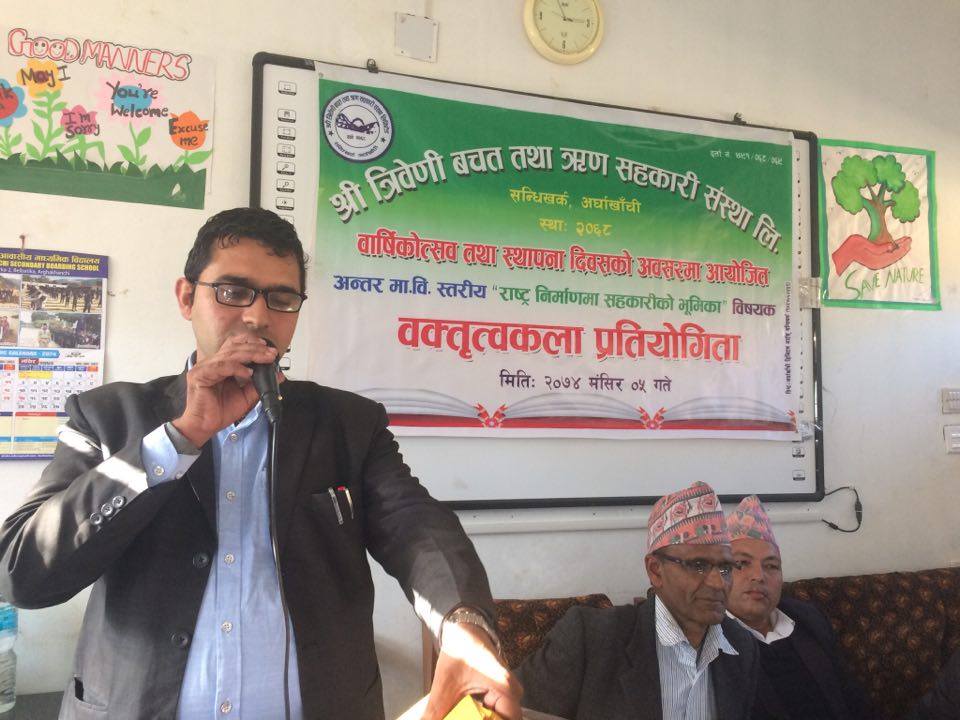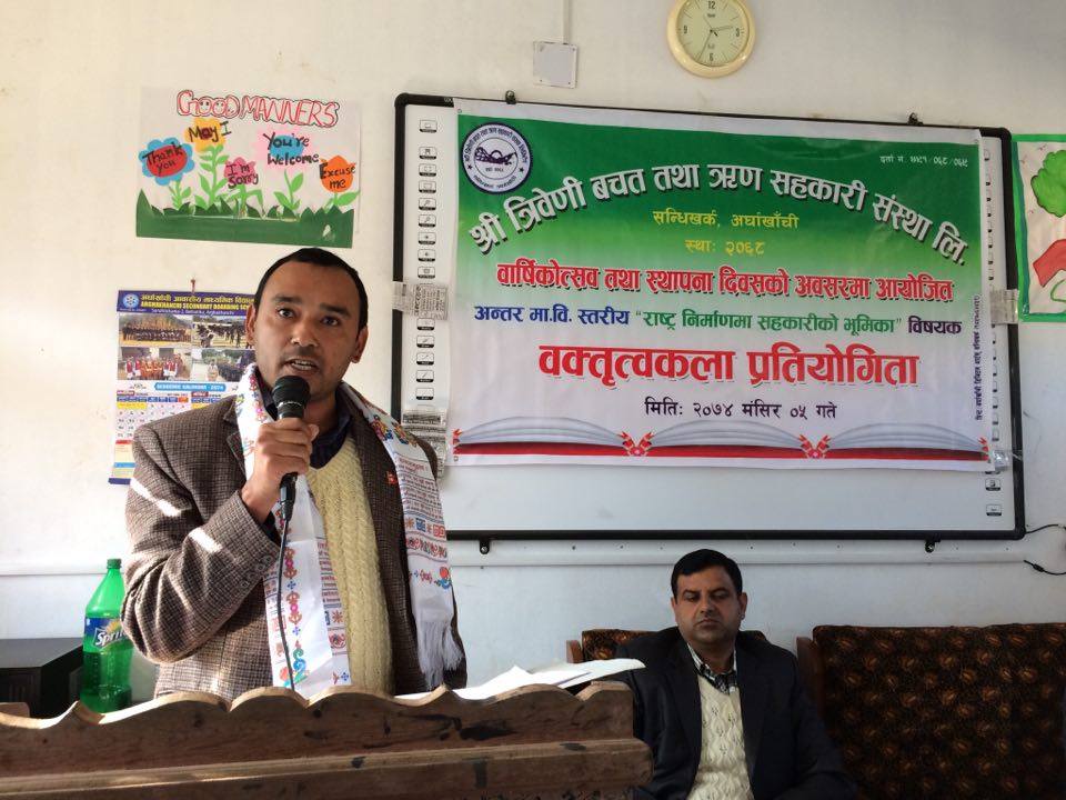 सन्धिखर्क, अर्घाखाँची मंसीर ५ ।  त्रिबेणी बचत तथा ऋण सहकारी संस्था लिमिटेड सन्धिखर्क २ चुत्राबेसीको आयोजनामा संस्थाको छैठौं बार्षिक उत्सव तथा स्थापना दिवसकोे अवसरमा अन्तर मावि स्तरीय वक्तृत्वकला प्रतियोगीता मंगलबार सन्धिखर्क स्थीत अर्घाखाँची आबासीय माबीमा सम्पन्न भएको छ ।