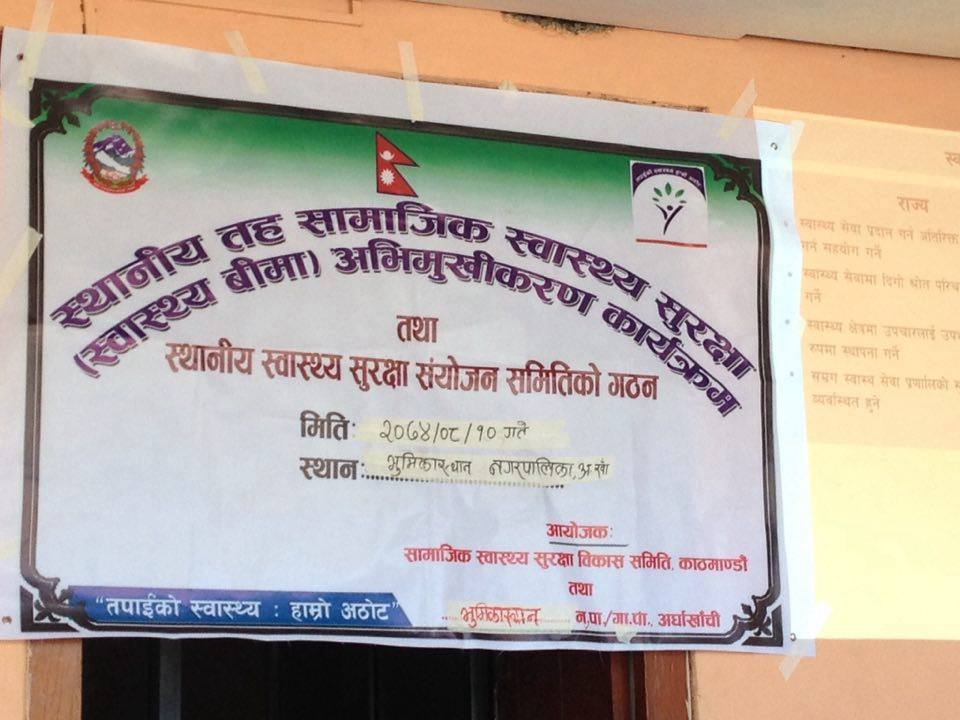 नुवाकोट, अर्घाखाँची । तपाईको स्वास्थ्य हाम्रो अठोट भन्ने मुल नाराका साथ सामाजिक स्वास्थ्य सुरक्षा विकास समिति काठमाण्डौं र भूमिकास्थान नगरपालिका अर्घाखाँचीको संयुक्त आयोजनामा आज भुमिकास्थान नगरपालिकाको कार्यालय नुवाकोट, अर्घाखाँचीमा १ दिने स्थानीय तह सामाजीक स्वास्थ्य सुरक्षा (स्वास्थ्य विमा) अभिमुखीकरण कार्यक्रम सम्पन्न भएको छ ।