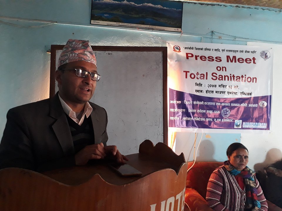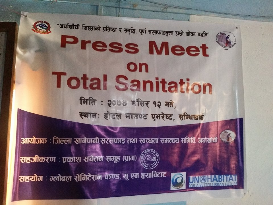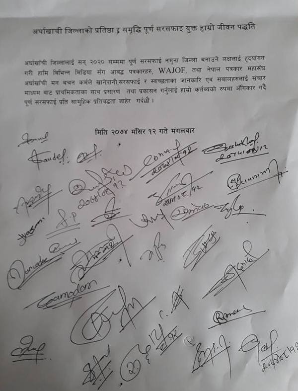 नेपालको १७ औ खुल्ला दिसा मुक्त जिल्ला घोषणा भएको अर्घाखाँचीलाई सन २०२० सम्ममा सरसफाइको नमुना जिल्ला बनाउन पत्रकारहरुले कलम चलाउने र जिल्लाको अभियानलाइ पुरा गर्ने बताएका छन ।