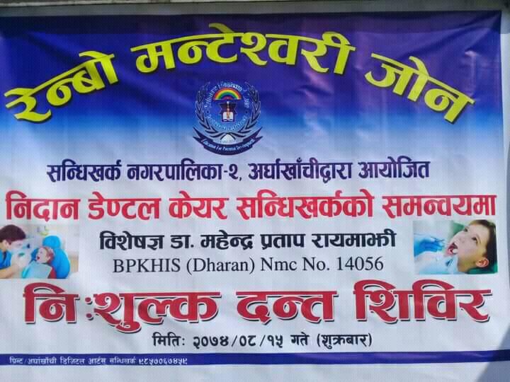 सन्धिखर्क, अर्घाखाँची । रेन्बो मन्टेश्वरी अर्घाखाँचीको आयोजना र निदान डेन्टल क्लिनिक सन्धिखर्कको समन्वयमा आज मन्टेश्वरी परिसरमा एक दिने निशुल्क दन्त शिबिर सम्पन्न गरिएको छ ।