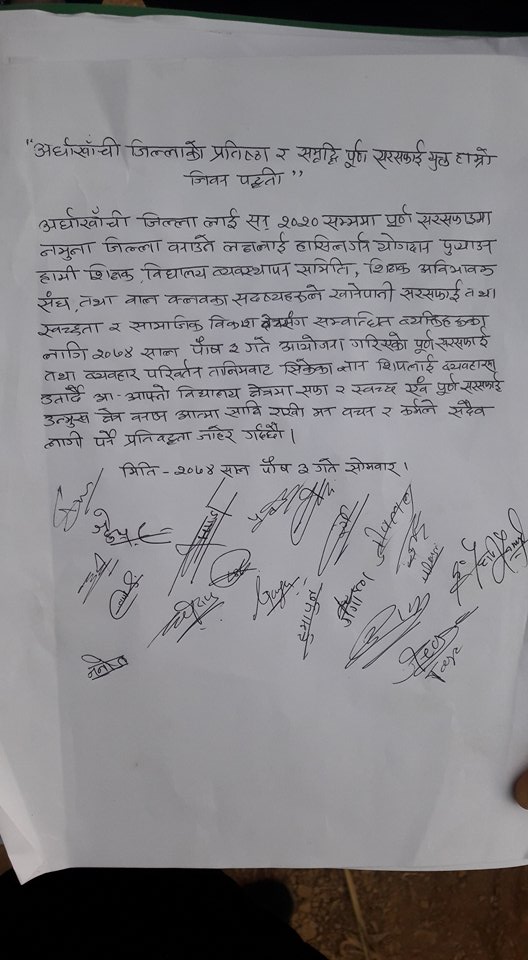 धनचौर, अर्घाखाँची (अर्घाखाँचीडट्कम) । अर्घाखाँची जिल्लाको भुमिकास्थान नगरपालिका वार्ड नं १० धनचाैरमा पुर्ण सरसफाइ तथा व्यवहार परिवर्तन सम्बन्धि तालिम सम्पन्न भएको छ ।