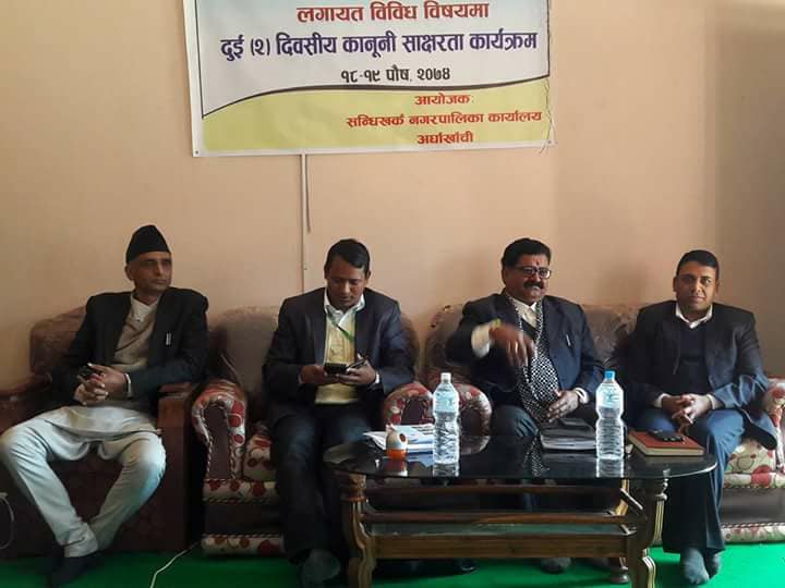कार्यक्रममा सन्धिखर्क नगरपालिका का नगरप्रमुख कमल प्रसाद भुसालले नगरबासि हरुको चाहान बमोजिम बिकास निर्माणले तिब्रता लिएको बताउदै भष्टचार मुक्त सफा सुन्दर नगरपालिका बनाउनका लागि अाफुहरु लागेको बताउदै नगरबासिहरुको सहयोग बाट देशको नमुना नगरपालिका बनाउन मा अाफुहरु सफल हुने बताउदै जनमुखि न्याय दिलाउनु न्यायिक समितिको काम कर्तब्य अधिकार भित्र पर्ने भएको ले सोही अनुसार गर्नु पर्नेमा जोडदिनु भयो ।
