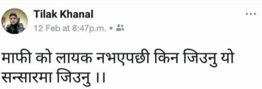 उता तिलकले हिजो सामाजिक सन्जाल फेसबूकमा “माफी को लायक नभएपछी किन जिउनु यो सन्सारमा जिउनु ।।” भनेर एक पोस्ट गरेका थिए ।