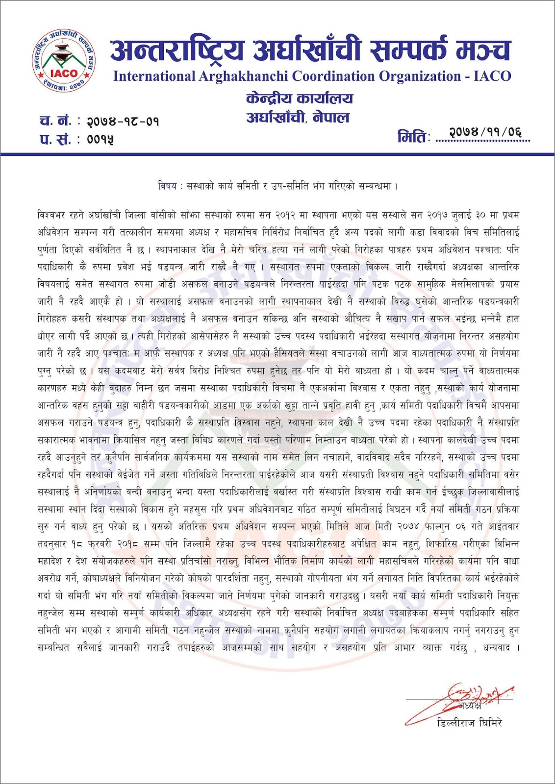 सन्धिखर्क, अर्घाखाँची (अर्घाखाँचीडट्कम) । अन्तरराष्ट्रिय अर्घाखाँची संपर्क मन्चका अध्यक्ष डिल्लीराज घिमिरेले अधिवेशनबाट सर्वसम्मत नयाँ समिती चयन भएको एक वर्ष नपुग्दै निर्वाचित समिती भंग गरेका छन् ।