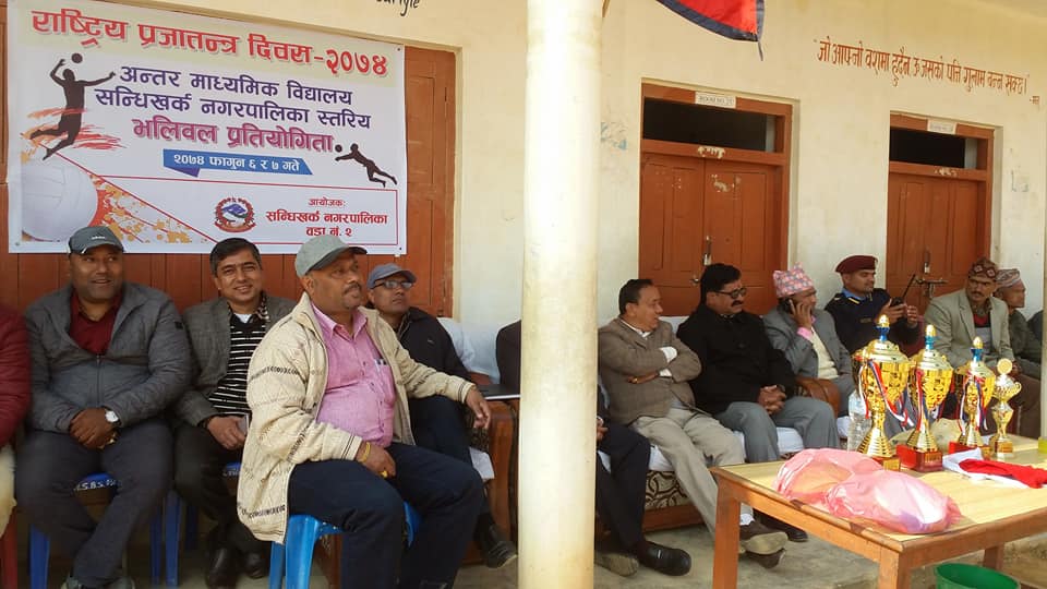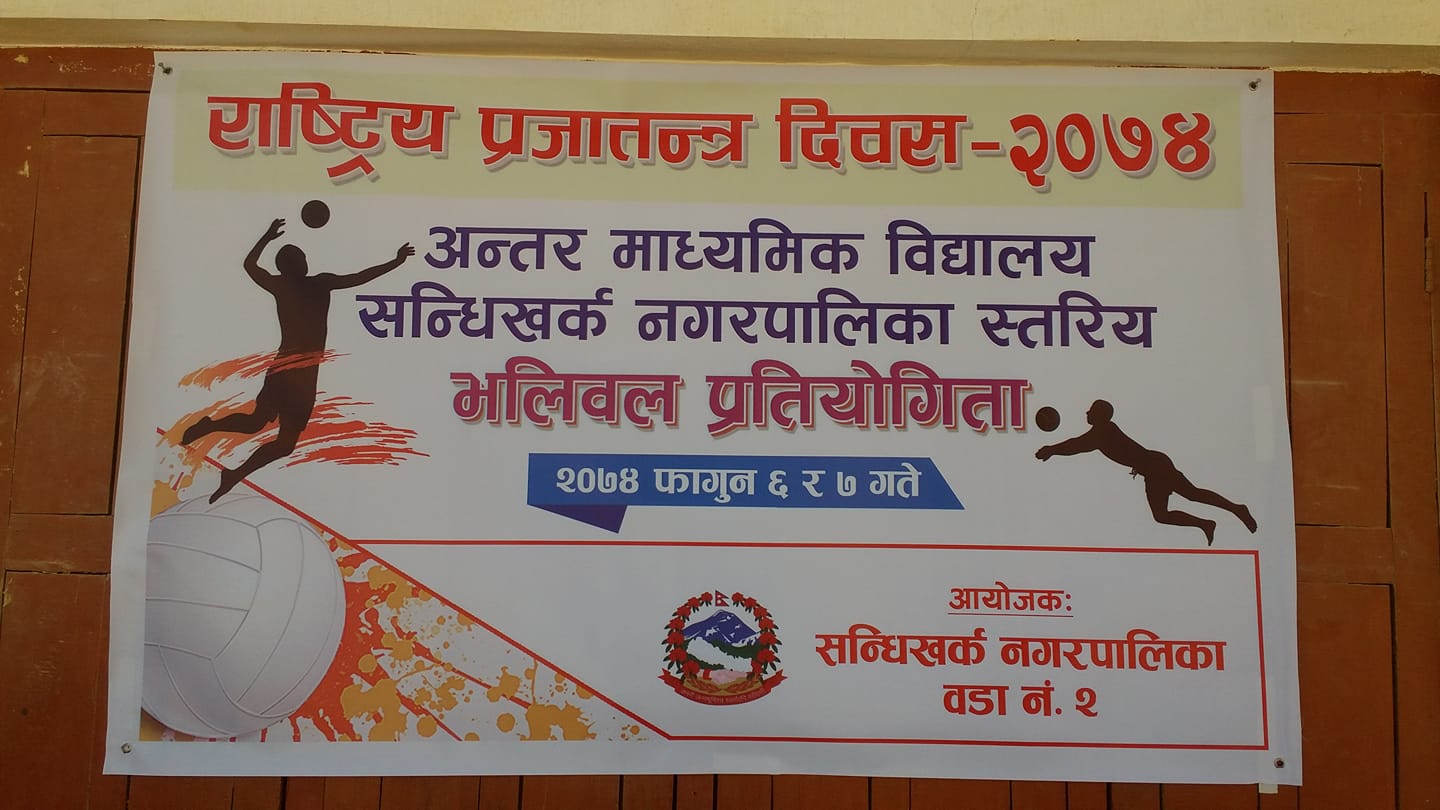रास्टिय प्रजातन्त्र दिबसको उपलक्ष्यमा आयोजित सो भलिबल प्रतियोगितामा नगर भित्रका १५ माध्यमिक बिधालय मध्ये १२ मा.बि. का खेलाडी हरुको सहभागिता रहेको छ । अर्घाखाँची आबासिय मा. बि. बेलबाटिकाको खेलमैदानमा सुरु भएको खेलको एक समारोहका बिच सन्धिखर्क नगरपालिकाका प्रमुख कमल प्रसाद भुसालले भलिबल सर्बिस गरि उदघाटन गर्नु भएको थियो।