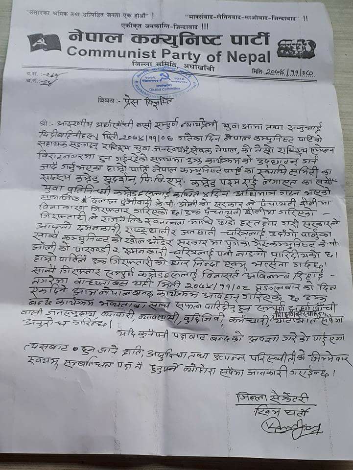 नेपाल कम्युनिष्ट पार्टी अर्घाखाँचीका जिल्ला सेक्रेटरी खिम घर्तीले हिजो निकालेको एक विज्ञप्ती अनुसार आफ्ना नेता-कार्यकर्ताहरुमाथि बिनाकारण दमन गरेको भन्दै नेकपाले त्यसको विरोधमा नेपाल बन्दको आव्हान गरेको बताइएको थियो ।