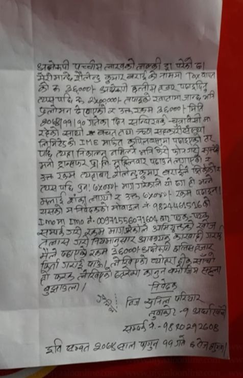 सबै कुराकानी भइसकेपछि तपाईँले त्यो पैसा प्राप्त गर्न केही ट्याक्स पठाइदिनु पर्छ, भनेपछि इमो कम्पनीको नामबाट आएको नम्बरबाट फोन आउँदा विश्वास गरेर आईएमईमार्फत ३६ हजार रुपन्देहीका शैलेन्द्र कुमार बहराईलाई सुनिलले पठाई दिए ।