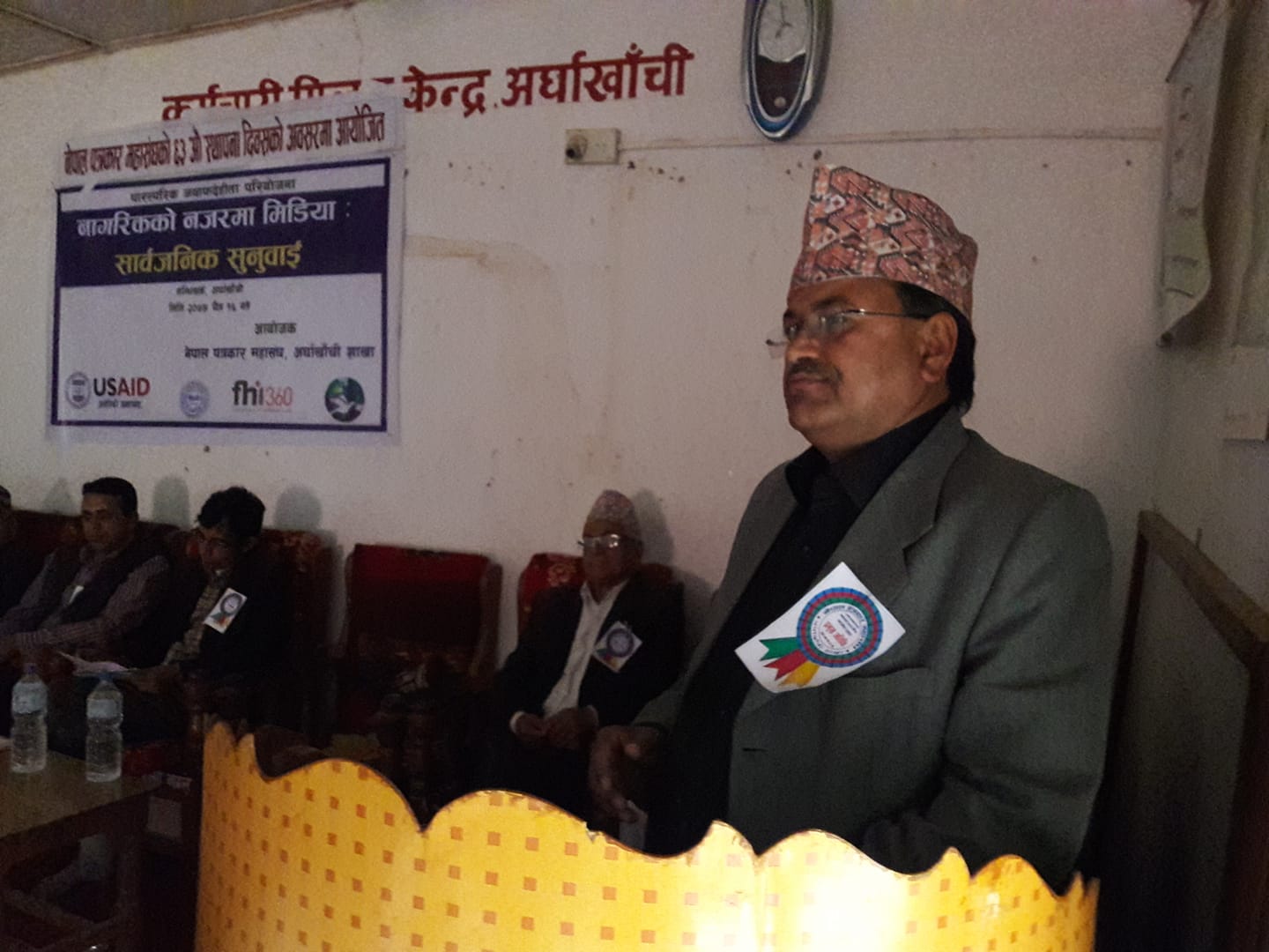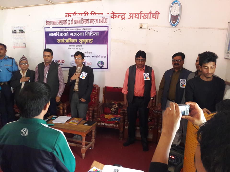 अर्घाखाँची शाखाको आयोजना तथा पारस्परिक जवाफदेहिता परियोजना एवं एकीकृत ग्रामीण विकास समाजको समन्वयमा “नागरिकको नजरमा मिडिया” बिषयक सार्वजनिक सुनुवाई कार्यक्रममा ५ नं प्रदेश सभा सदस्य माननीय रामजी प्रसाद घिमिरेले समयअनुकूलको भुमिका निराब गर्नुपर्ने ,हिजोका दिनमा ब्यबस्था परिबर्तनको निम्ति पत्रकारले खेलेको भुमिकाको उच्च सम्मान गर्दै अब समायनुकुल पत्रकारहरुले रास्ट्र लाई समृद्ध ,सुशासन आर्थिक रुपले उच्च स्तरमा पुर्याउन यसतर्फ पत्रकार अगाडि बढने समय आएको बताएका थिए ।