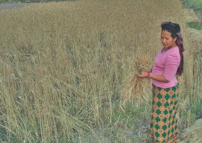 नरपानीको पावरामा उत्पादन भएको गहुँ काट्दै कृषक । अहिले गहुँको बालामा दाना थोरै फलेका छन् ।