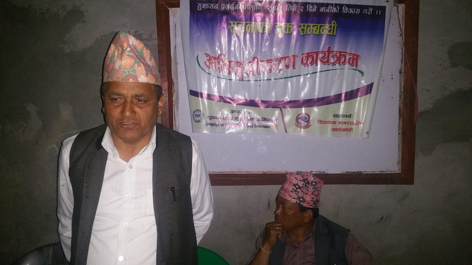 जुकेना, अर्घाखाँची । सुशासन प्रबद्र्धनका लागि सूचना लिने र दिने बानीको विकास गरौ भन्ने मूल नारा सहित सूचनाको हक सम्वन्धी अभिमुखिकरण कार्यक्रम हिजो विहान अर्घाखाँचीको शितगंगा ६ जुकेनाको देउरालीमा र अपरान्ह वडा नम्वर ५ गल्दामा सम्पन्न भएको छ ।