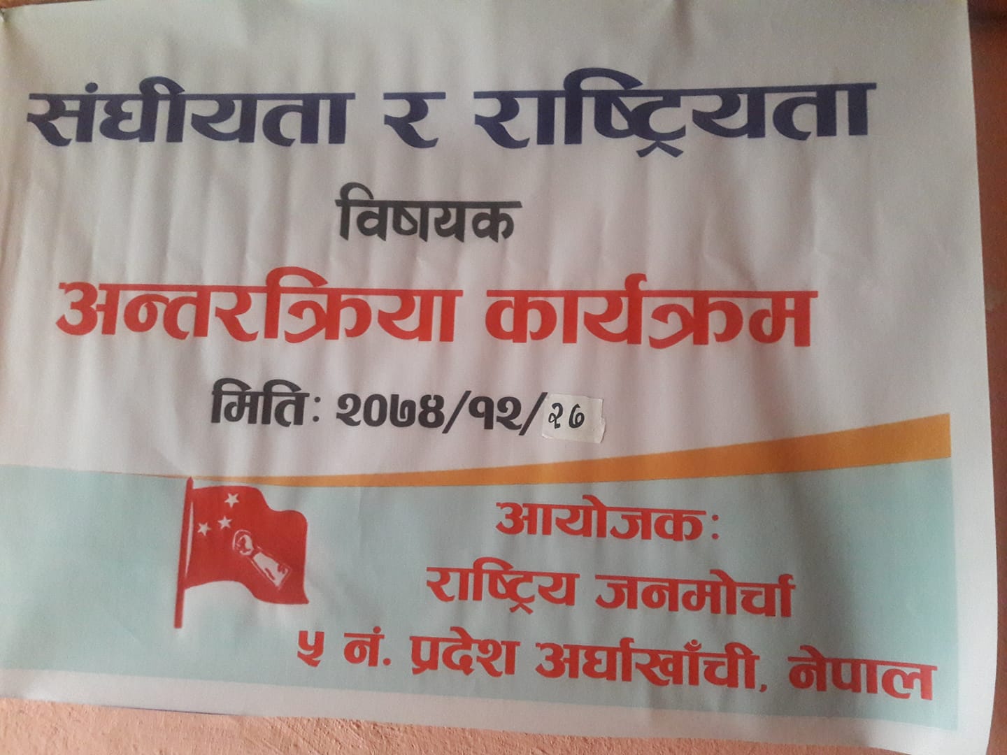 राजमोको केन्द्रिय कार्यक्रम अनुसार संविधान र राष्ट्रियता बिषयक अन्तरक्रियामा जनमोर्चाका पाँच नम्बर प्रदेश सदस्य नेता शेर बहादुर बिसीले नेपालमा संघियताको आवश्यकता नभएको बताउँदै खारेज हुनुपर्नेमा जोड दिए ।