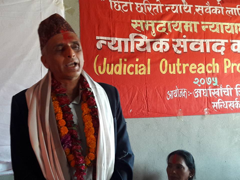 छत्रदेब, अर्घाखाँची बैशाख ७ । जिल्ला अदालत अर्घाखाँचीका माननीय न्यायाधीश रामचन्द्र पौडेलले सुनुवाइ बिना दोषी नठराएमा र आफ्नै मुद्दा नसंझेर स्वतन्त्र रुपले न्याय सम्पादन गरे सबै मान्छे नै न्यायाधीश भएको बिचार ब्यक्त गर्नु भएको छ।