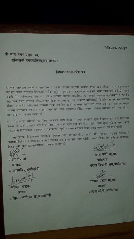 अनेरास्ववियु,नेविसंघ,अखिल क्रान्तिकारी र अखिल छैठौं अर्घाखाँचीले पालिकामा बुझाएको ध्यानाकर्षण पत्रमा संस्थागत विद्यालय शुल्क निर्धारण माप दण्ड निर्देशिका २०७२ को ठाडो उल्लंघन गरी निजी विद्यालयले गरेको चर्को शुल्क वृद्धि अबिलम्ब फिर्ता गराउन, ती विद्यालयको अनुगमन गरी मापदण्ड नपुगी संचालन गरिएका विद्यालयलाई कारवाही गर्न र सार्बजनिक विद्यालयको शिक्षाको गुणस्तर वृद्धि गरि,सार्बजनिक शिक्षा प्रति बिश्वास बढाउन प्रभाबकारी अनुगमन,निर्देशन र आवश्यक कार्यहरु तत्काल अगाडि बढाउन माग गरिएको छ ।