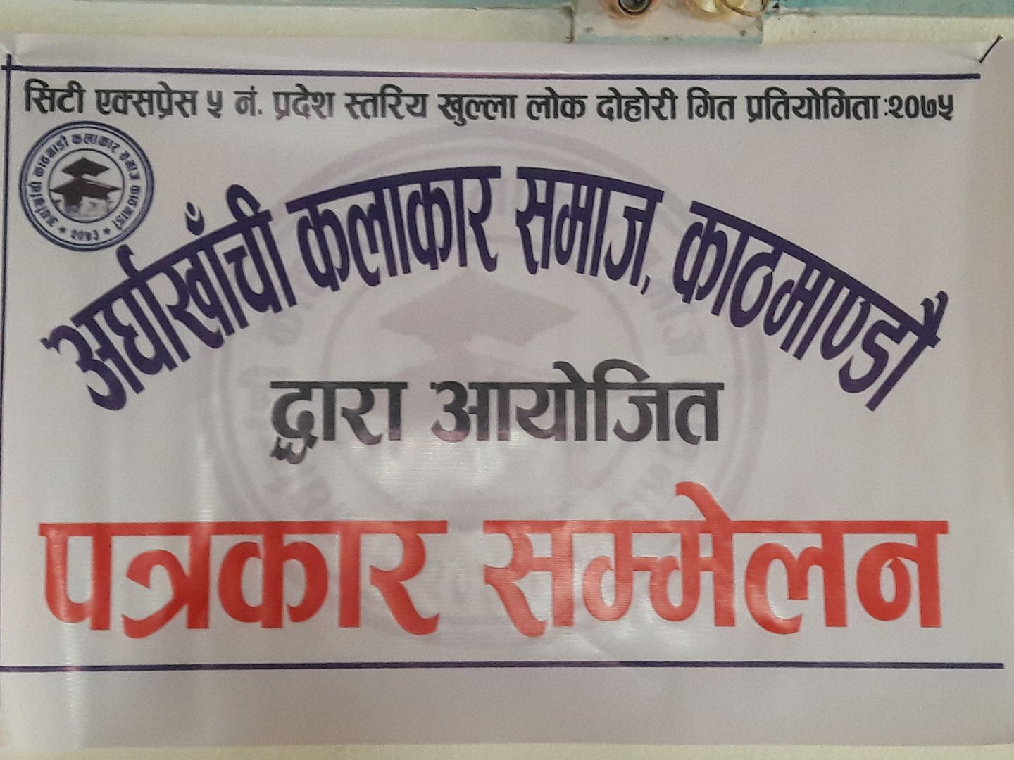 अर्घाखाँची कलाकार समाज काठमाडौको आयोजनामा सन्धिखर्कको टुडिखेलमा हुन गईरहेको ५ नम्बर प्रदेश स्तरिय दोहोरी प्रतियोगिता तथा विविध सांस्कृतिक कार्यक्रमको संस्थाका अध्यक्ष मधुसुधन बन्जाडेले सन्धिखर्कमा पत्रकार सम्मेलन गरि तयारी पुरा भएको बिषयमा जानकारी दिएका थिए ।