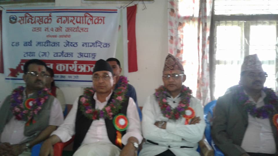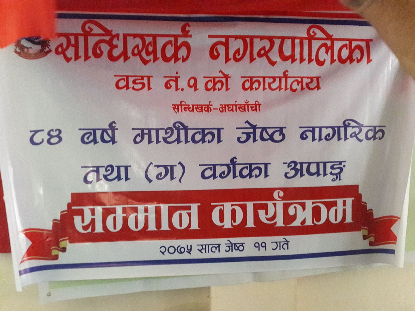 सन्धिखर्क, अर्घाखाँची (अर्घाखाँचीडट्कम) । अर्घाखाँची जिल्लाको सन्धिखर्क नगरपालिका वार्ड नम्बर १ काे अायाेजनामा ८४ वर्ष माथिका जेष्ठ नागरिक तथा (ग) वर्गका अपाङ्ग सम्मान कार्यक्रम सम्पन्न भएको छ ।