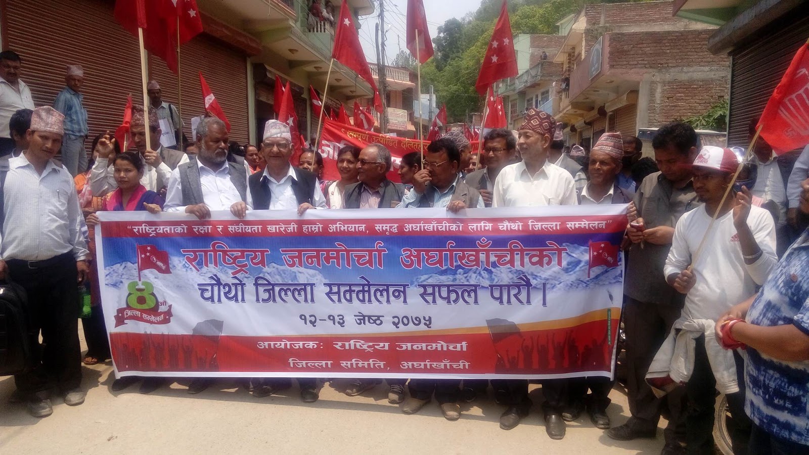 सन्धिखर्क, अर्घाखाँची । राष्ट्रिय जनमाेर्चा (राजमो) जिल्ला समिति अर्घाखाँचीकाे चाैथाे जिल्ला सम्मेलन अर्घाखाँची जिल्लाको सदरमुकाम सन्धिखर्कमा शुरु भएको छ ।