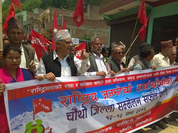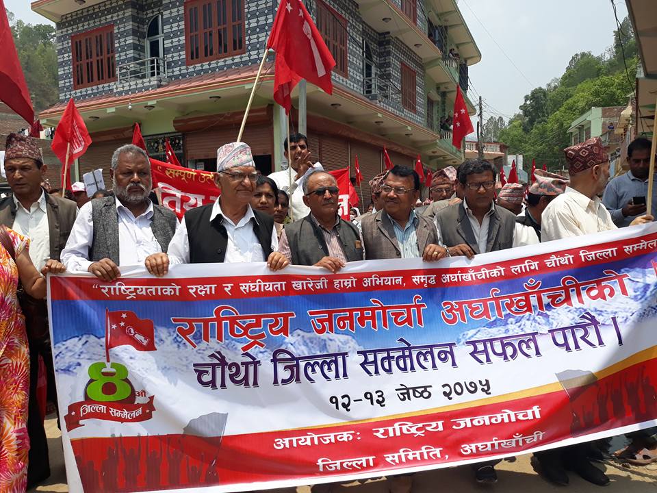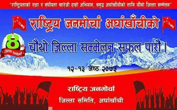 सन्धिखर्क, अर्घाखाँची । राष्ट्रिय जनमाेर्चा (राजमो) जिल्ला समिति अर्घाखाँचीकाे चाैथाे जिल्ला सम्मेलन अर्घाखाँची जिल्लाको सदरमुकाम सन्धिखर्कमा शुरु भएको छ ।