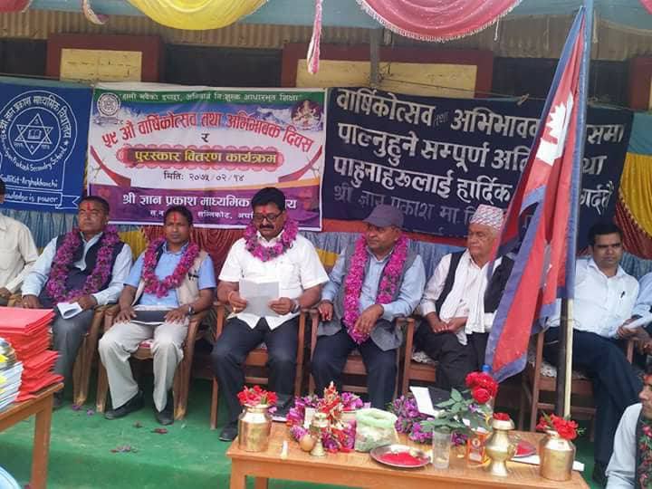 कार्यक्रममा शुभकामना मन्तव्य राख्दै प्रमुख अतिथि पिताम्बर शर्मा भुसालले सामुदायिक बिद्यालय पनि निजी बिद्यालय सरह  सफल , उदाहरणीय र नमुना बनाउन सकिन्छ कुरा आज ज्ञान प्रकाशले प्रष्ट पारेको बताए । उनले जिल्लामा नमुना बिद्यालयको रुपमा उभ्याएको र आगामी दिनमा अझ देशकै एक अग्रणी शैक्षिक धरोहरको रुपमा स्थापित हुन सफल होस् भनी शुभकामना ब्यक्त गरे ।