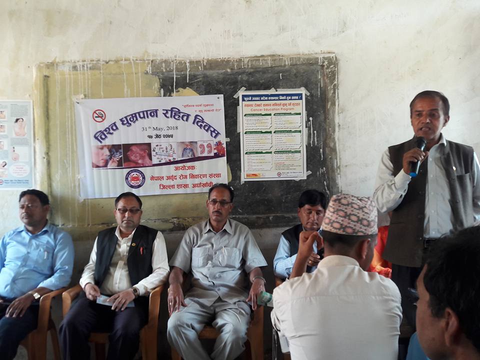 संस्थाका अध्यक्ष पिताम्बर बन्जाडेको अध्यक्षतामा सम्पन्न कार्यक्रममा क्यान्सर रोगबारे जिल्ला स्वास्थ्य कार्यालयका पूर्व स्वास्थ्यकर्मी तथा सन्धिखर्क नगरपालिका वडा नम्बर ३ का अध्यक्ष लिलाराम गौतमले क्यान्सर रोगबारेमा प्रकाश पार्नुभएको थियो ।