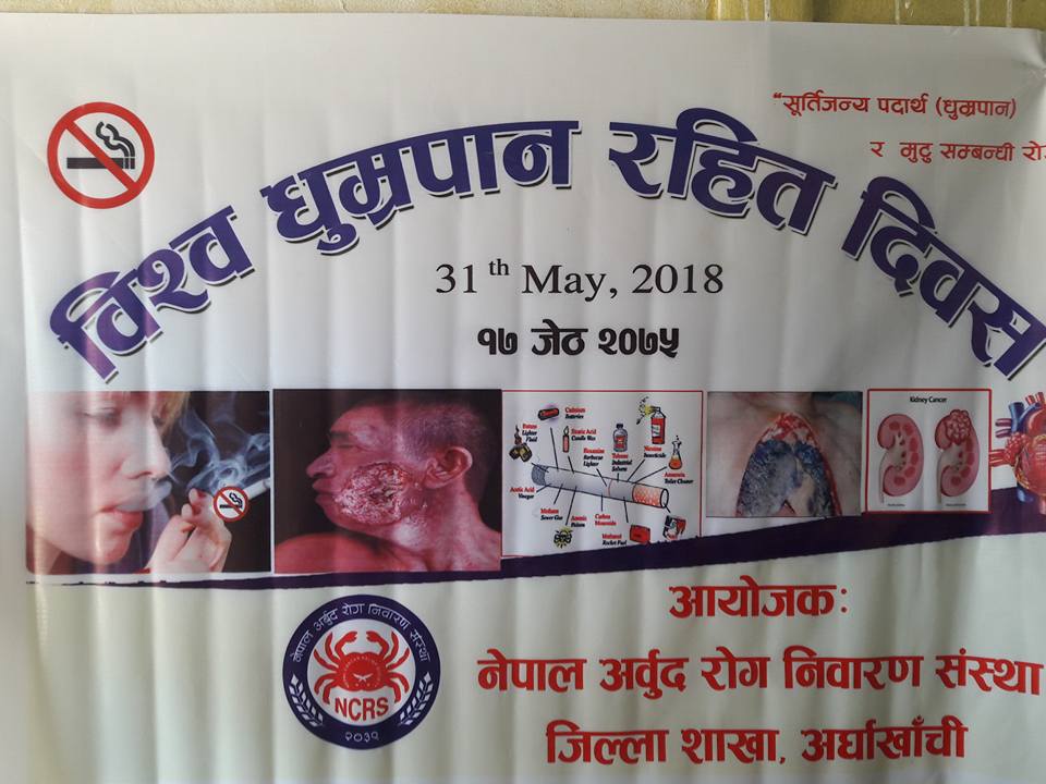 नुवाकोट, अर्घाखाँची (अर्घाखाँचीडट्कम) ।  मे १ अर्थात् जेठ १७ का दिन अर्घाखाँचीमा पनि विश्व धुम्रपान रहित दिवस मनाइएको छ । नेपाल अर्बूद रोग निवारण सस्थाको आयोजनमा भूमिकास्थान नगरपलिकाको वडानम्बर ७ मा अवस्थित नुवाकोट माध्यमिक विद्यालय चिदिचौरमा जनचेतनामूलक कार्यक्रम गरि मनाइएको छ ।
