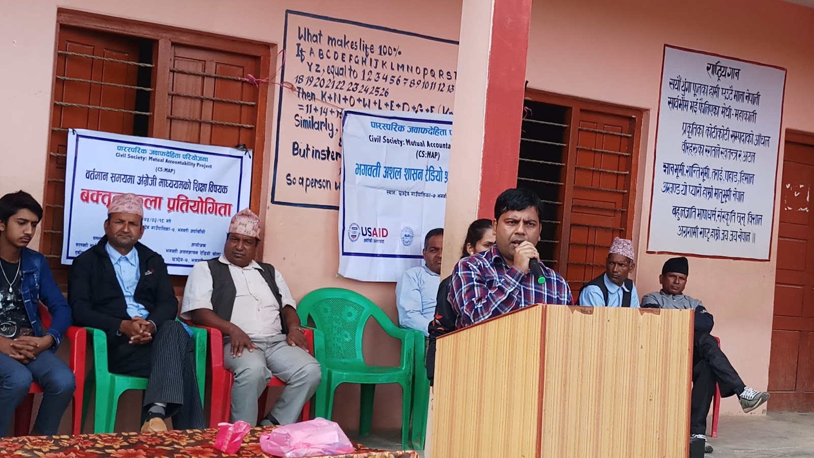 पारस्परिक जवाफदेहिता परियोजना अन्र्तगत गठित श्रोता समुहले गाउँपालिकाले अंग्रेजी माध्यमको शिक्षा दिन सुरु गरेपछि त्यसको प्रभावकारीता तथा महत्वको बारेमा छलफल तथा बक्तृत्वकला प्रतियोगिता आयोजना गरेको हो । श्रोता समुहको आयोजना, सरस्वति माबि भुस्खात र एकीकृत ग्रामीण विकास समाज अर्घाखाँचीको समन्वयमा कार्यक्रम सम्पन्न भएको हो ।
