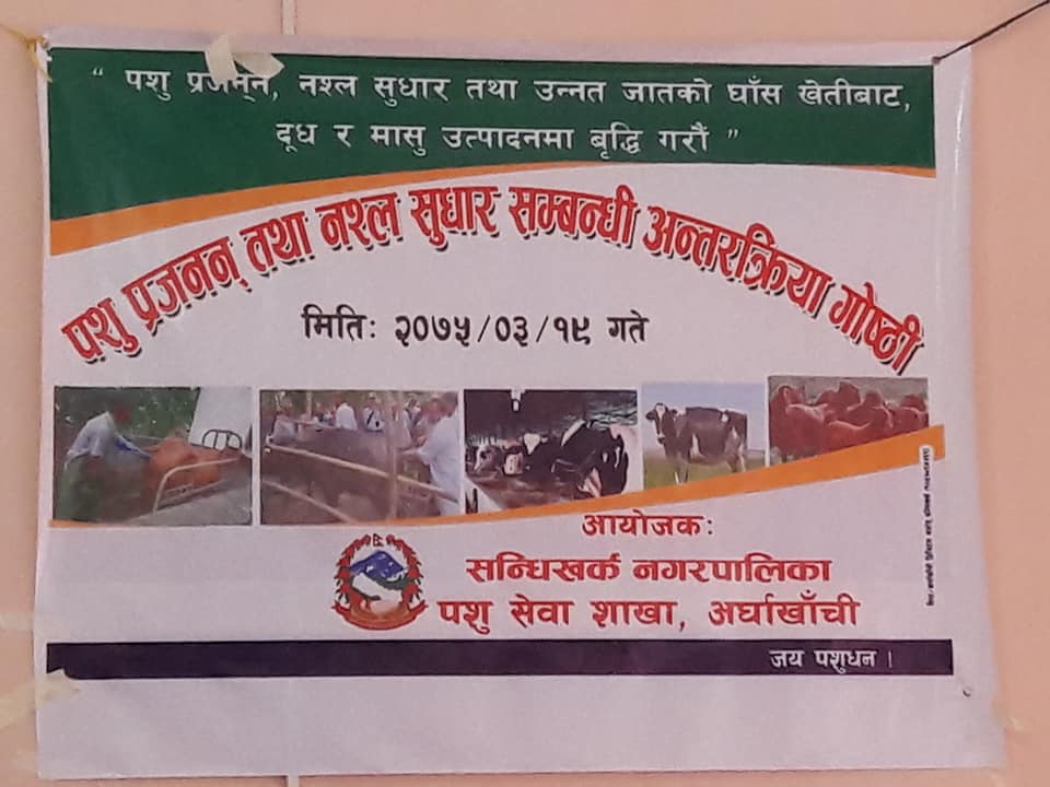 कार्यक्रम सन्धिखर्क नगरपालिका पशु स्वाथ्य प्रमुख राधा पान्डेको सन्चालनमा सम्पन्न भएको कार्यक्रममा नगरभित्रका पसुपालक किसानहरुको सहभागीता रहेको थियोे ।