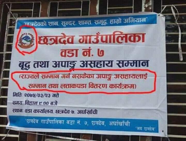 छत्रदेव वार्ड नम्बर ७ को आयोजनामा सम्पन्न उक्त बृद्ध तथा अपाङ असहाय सम्मान कार्यक्रममा ” राज्यले सम्मान गर्न नसकेका अपाङ असहायलाई सम्मान तथा लत्ताकपडा वितरण कार्यक्रम” भनी लेखिएको व्यानरलाई लिएर  सामाजिक सन्जालहरुमा व्यापक आलोचना भएको छ ।