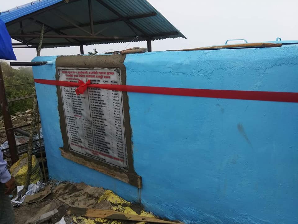 पानी ट्यांकीको वार्ड अध्यक्ष नारायण प्रसाद खनालले उद्घाटन गर्नुभएको हो । ट्यांकीको उद्घाटन गर्दै वार्ड अध्यक्ष खनालले युवाहरुको सक्रियताको प्रशंशा गर्नुभयो ।