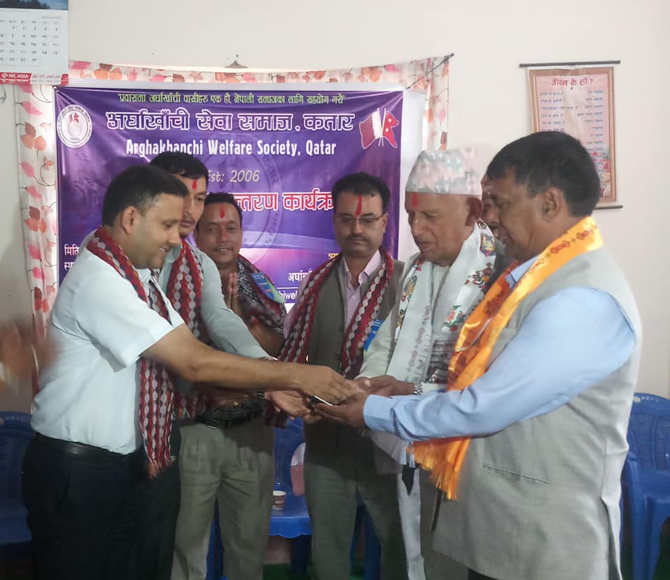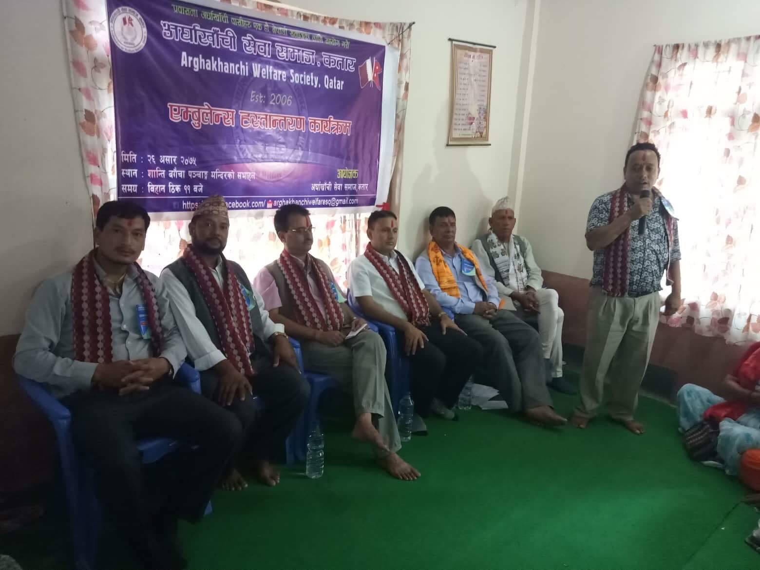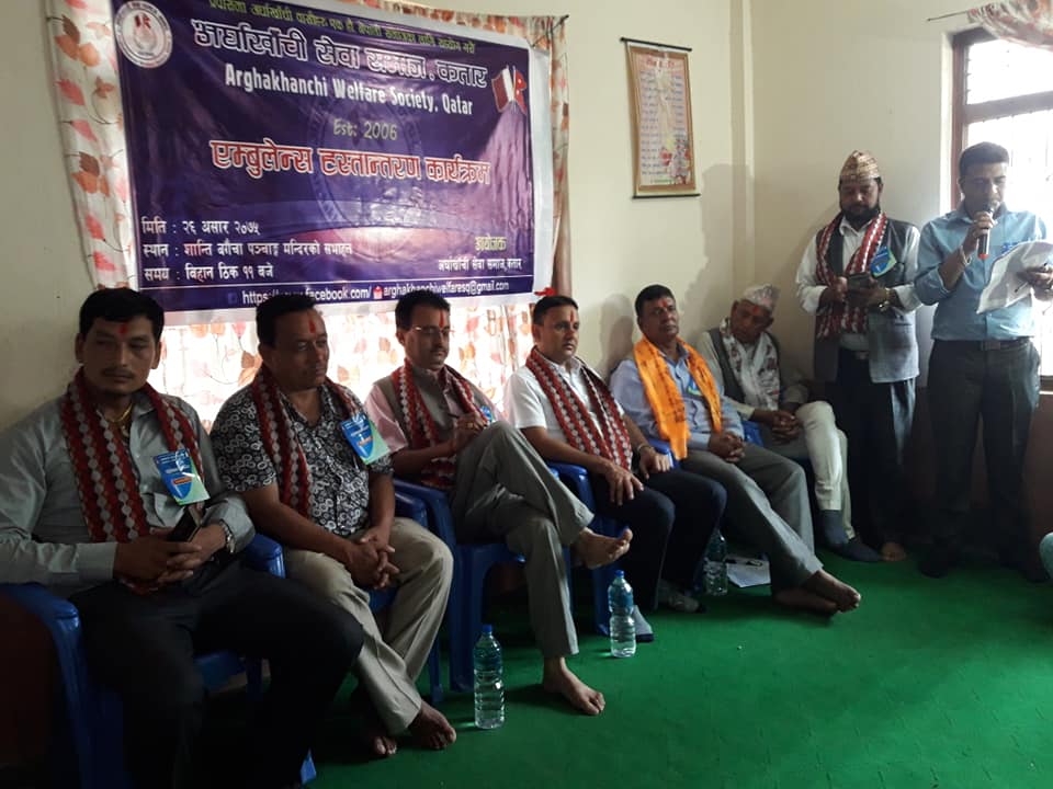 प्रवासमा अर्घाखाँचीबासीहरु एक होऔ नेपाली समाजकालागि सहयोग गरौ भन्ने नाराकासाथ विरामीको सेवाकोलागि एम्बुलेन्स किनी हस्तान्तरण गरिएको अर्घाखाँची सेवा समाज कतारका पुर्व कोषाध्यक्ष राजकुमार श्रेष्ठले बताए । झण्डै १२ लाखमा एम्बुलेन्स खरिद गरि हस्तान्तरण गरेको हो ।
